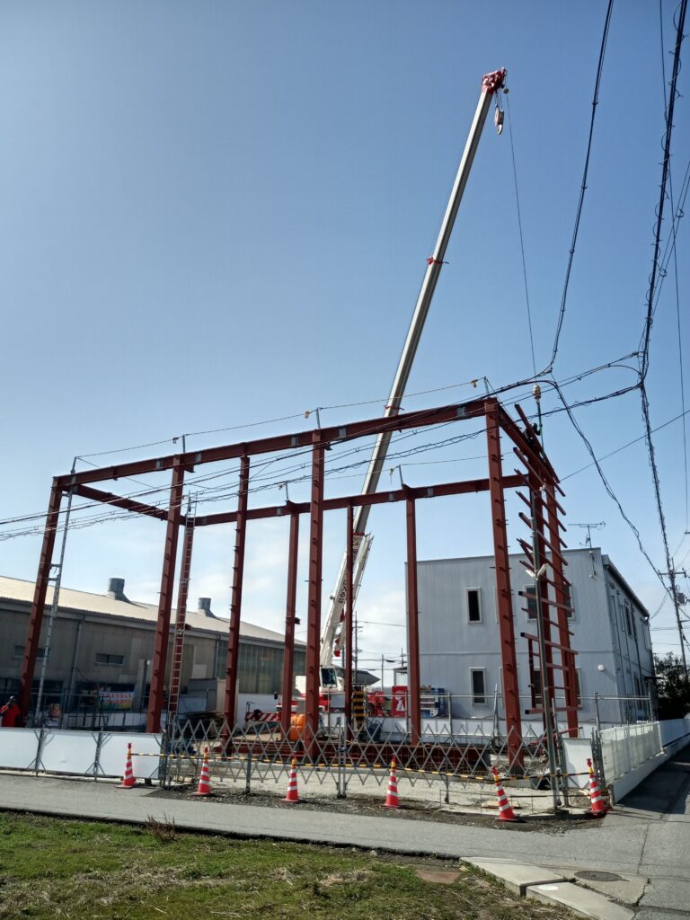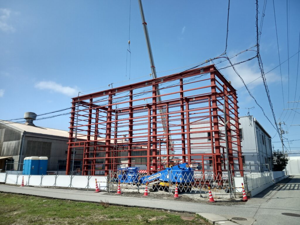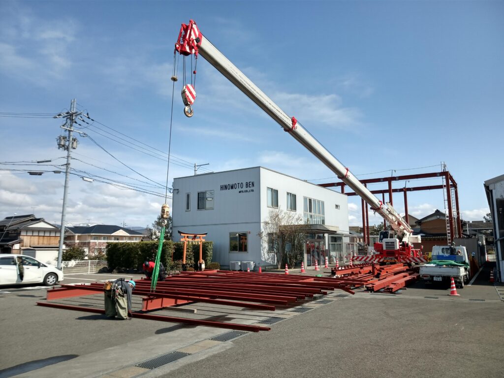 ラック倉庫建設工事 進んでます! お知らせ 2022年3月16日 1月末から始まったラック倉庫の建設工事が着々と進んでいます。 今週から鉄骨建方が始まり、建物の形になってきました。 テント倉庫修理稲荷初午大祭