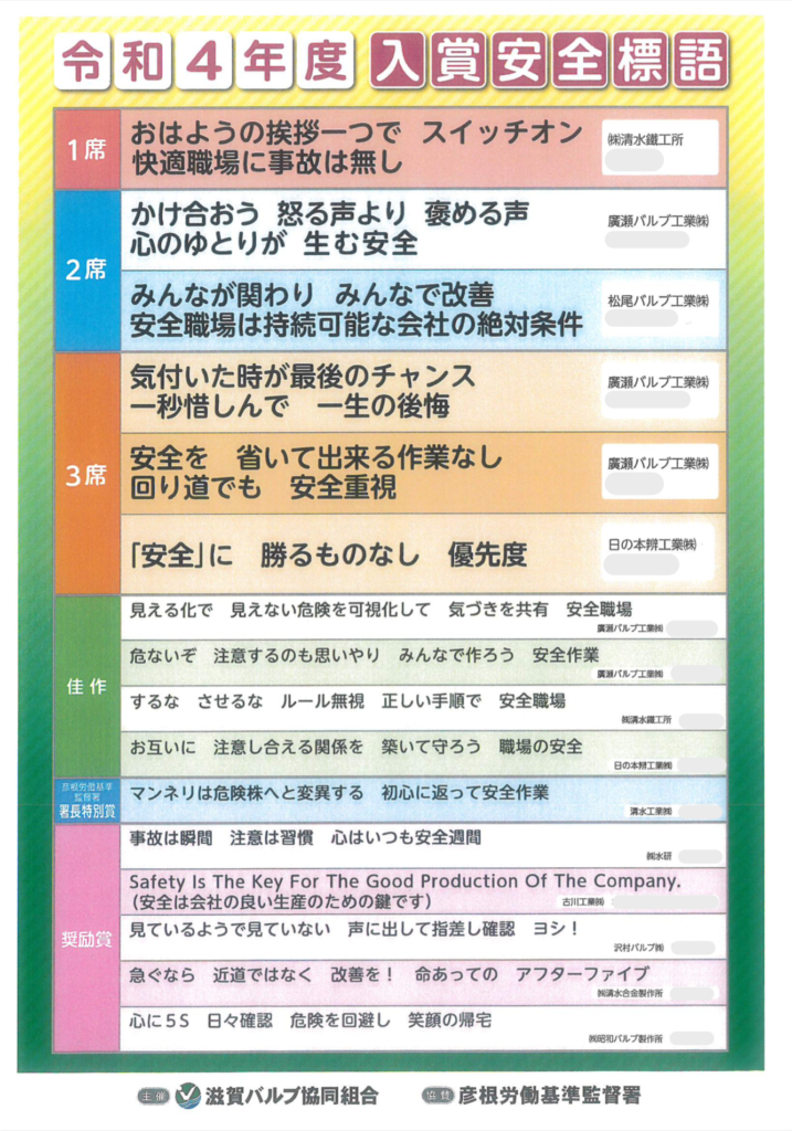 令和4年度 安全標語 お知らせ 2022年9月26日 毎年恒例となっている、滋賀バルブ協同組合主催の安全標語募集に今年も応募し 昨年に引き続き今年度も弊社社員の安全標語が入選できました! 今年度は3席1名、佳作1名、計2名の入選です。 引き続き、安全意識の高揚と安全活動の定着に努めていきたいと思います。 滋賀バルブ協同組合の安全標語掲載ページはこちらからご覧頂けます。 安全標語 ↓3席入選作品 ↓佳作入選作品 リクナビ2024掲載スタート!第79回 創立記念稲荷大祭