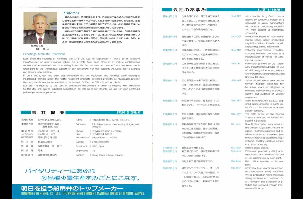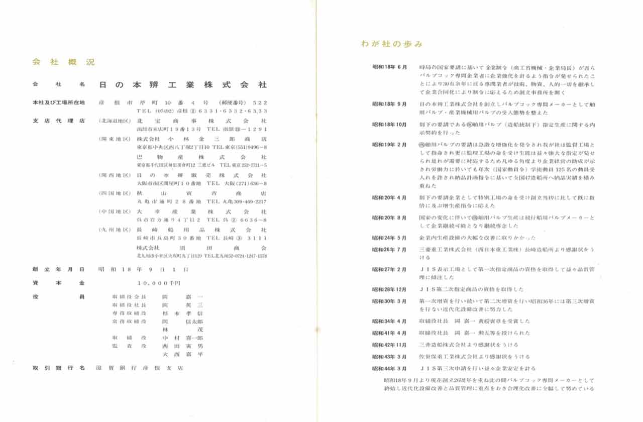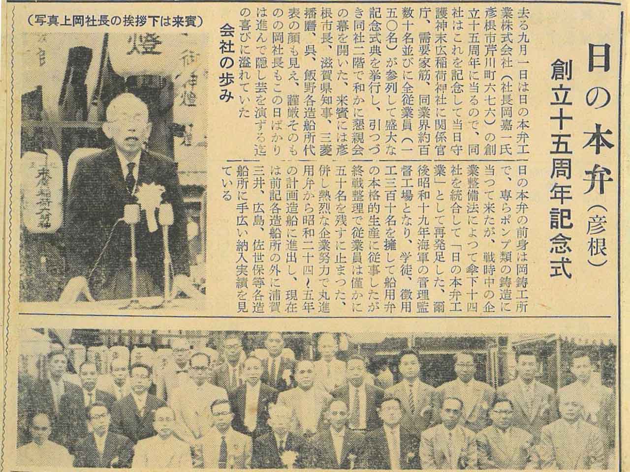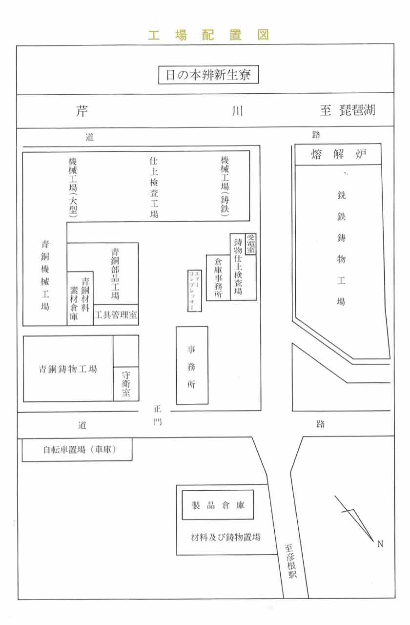 太平洋戦争開戦を契機に戦時統制が強化(企業整備令)され、岡鋳造所を中心に数社が統廃合し、彦根市芹町に於いて日の本辨工業(株)が設立 岡 嘉一 社長就任 |